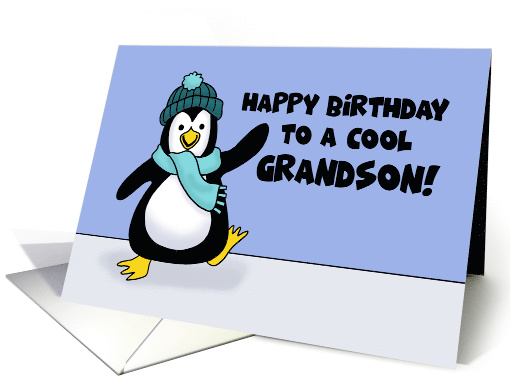Cute birthday card for a Grandson. The front shows a cartoon penguin in hat and scarf and dancing. The words say: Happy birthday to a cool Grandson! Best wishes on your birthday!