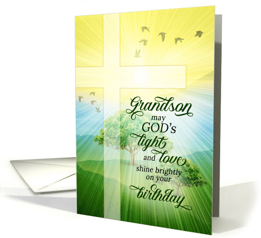 Beautiful trees on a green hillside and sunshine through a Christian cross create a lovely pairing with a message of God's blessings on this birthday card for your Grandson.