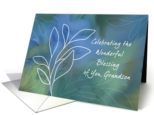 This beautiful birthday card for your older grandson features a serene watercolor background in soothing shades of blues and greens. The soft, calming colors create a peaceful atmosphere, perfect for sending warm birthday wishes and blessings. The centerpiece of the card is a delicate branch outlined in white, with subtle branches gently visible over the background. The branch symbolizes growth and strength, reminding your grandson of his own personal growth and the steadfast love of God and his family. This elegant design is sure to bring a smile to your grandson's face and make him feel loved on his special day. It's the perfect way to express your gratitude for the wonderful person he is and the blessing he is to your family.