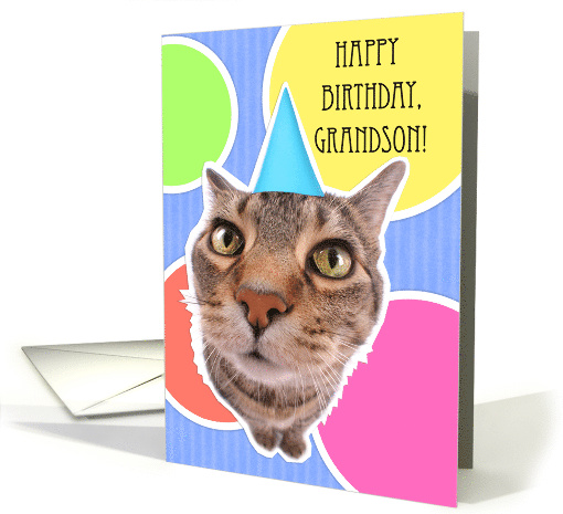 A cute kitty cat in a party hat wants to wish your grandson a happy birthday! This cute little guy is sure to make your grandson smile.