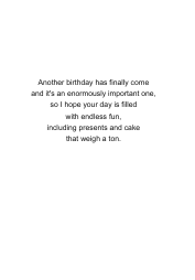 | Inside: | Another birthday has finally come and it's an enormously important one, so I hope your day is filled with endless fun, including presents and cake that weigh a ton. |