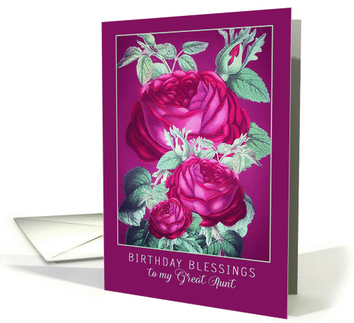 | Artist Notes: | A beautiful, elegant religious Birthday card for your Great Aunt. Lovely red/pink roses on a purple background and a warm, loving text inside the card (which can be edited). |