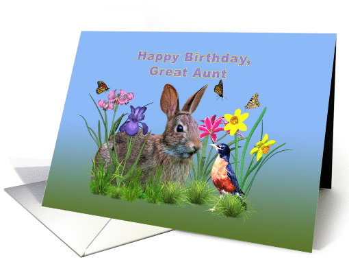 | Artist Notes: | A colorful birthday card for a great aunt features spring flowers, a red breasted robin, a cuddly brown rabbit, and butterflies. The flowers shown include bright yellow daffodils and purple irises. |