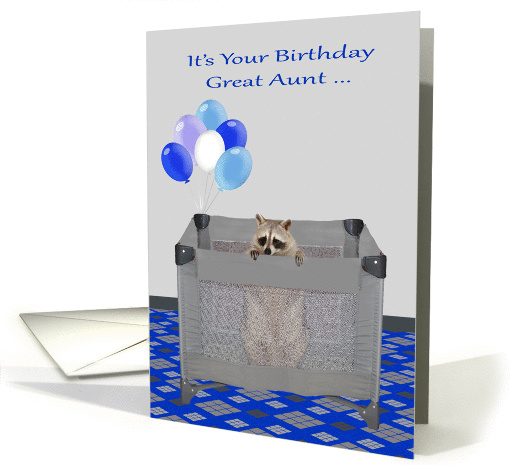 | Title: | Birthday to Great Aunt, humor, a cute raccoon in a playpen, balloons |