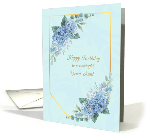 | Artist Notes: | Say Happy Birthday to your great aunt with this beautiful card. A golden colored frame has two blue hydrangea bouquets sitting on opposite corners on a pale blue background. |