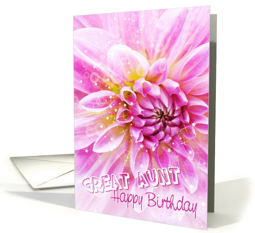 | Artist Notes: | A vibrantly cheerful card for Great Aunt, featuring a close up photographic image of a mainly pink 'Gerry Hoek' Dahlia. A swish of stars and bokeh circles add an extra graphically created sparkle to this design. |