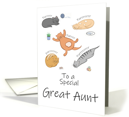 | Artist Notes: | Wish a special great aunt a happy birthday with this funny greeting card showing 5 humorous looking cartoon cats sleeping and purring. The inside verse says, "Hope you have a simply purr-ific birthday!" |
