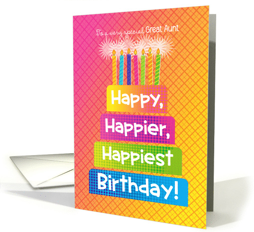 | Artist Notes: | Stack up the birthday wishes with this bright and beautiful card suitable for a special great aunt you'd like to celebrate. Colors and candles glow and bright patterns combine to wish her the Happy, Happier, Happiest Birthday ever! Hope it's the best ever! |