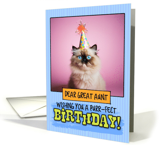 | Artist Notes: | A Himalayan cat wearing a birthday hat on a light-blue and pink background with a stripe pattern with 'dear great aunt' in an orange box and the text "wishing you a purr-fect birthday!". A fun card to send to your great aunt for their birthday. |