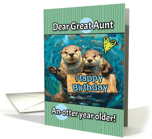 | Artist Notes: | A cute otter duo floating on their backs in the water are holding up a sign that spells HAPPY BIRTHDAY on a teal background with a stripe pattern and the text "dear great aunt an-otter year older!" A fun pun card to send to your wonderful great aunt for their special day. |