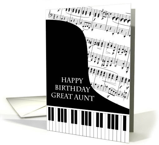 | Artist Notes: | A birthday card for a great aunt who is into piano music. A grand piano with the keys along the bottom of the card. A sheet of music fills the background. A great card for somone who loves music. This is NOT a musical card, it does NOT play music: |