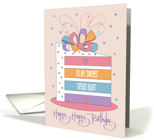 "Happy, Happy Birthday" is the magnificently artistic lavender wording that floats across the bottom of this uniquely designed rainbow cake birthday card for your Great Aunt. Always one to enjoy a birthday cake on her special day, your Great Aunt will be thrilled with this card's brilliantly colored piece of cake, the cake's horizontal stripes of pink, lavender, orange and blue and the wording across the stripes that says "To my sweet Aunt". More wording, beautifully hand lettered in lavender, rolls across the base of the card, with the words "Happy, Happy Birthday". A magnificent bow of orange, blue, lavender and pink tops the slice of white frosted cake, accentuating all of the colorful sprinkles decorating it. The card's inside wording says "A rainbow of sweet birthday wishes for you! Wishing you joy the whole day through, with love."