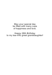 A quaint little pink teacup filled with a beautiful bunch of lily of the valley flowers along with the hand lettered words Happy Birthday on the top of card. A sweet birthday card for your great granddaughter turning 28.