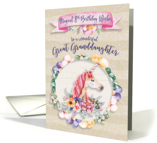 | Artist Notes: | Send sweet Happy 8th Birthday greetings to your great granddaughter with this pretty design featuring a unicorn surrounded by colorful flowers on a wreath. |