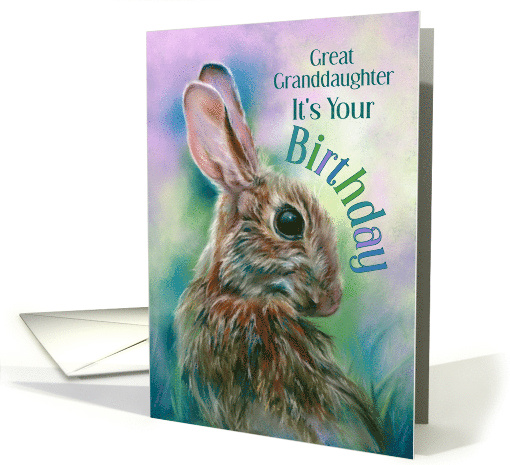 Your great granddaughter will adore this sweet birthday greeting embellished with animal art in soft pastels picturing a small bunny rabbit with fluffy brown fur among blades of grass rendered in pastel hues of blue, green and purple.