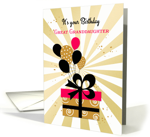 A festive birthday greeting for a Great Granddaughter with a gold sunburst background. There is a pretty package in gold and pink tied with a black bow and a bouquet of coordinating balloons. The card is designed for an older or teen aged Great Granddaughter.