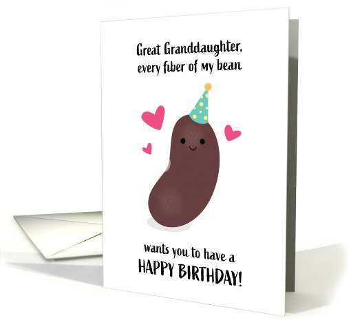 Cute and punny birthday card featuring a little brown bean wearing a green polka dot party hat and surrounded by hearts is the perfect way to share a smile with your great granddaughter on her special day.
