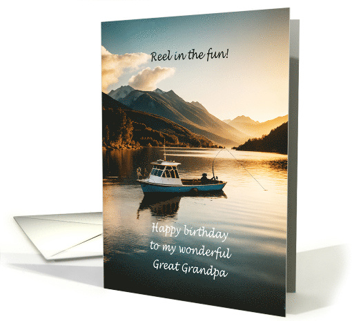 A birthday card for a great grandpa. A unique fishing birthday card with a mountain lake scene, designed for men who love fishing, boating, and the great outdoors. Celebrate his special day with a fishing birthday card featuring a man fishing from a boat on a mountain lake. A perfect birthday card for outdoors men, dads, husbands, and fishing lovers—ideal for anyone who enjoys the great outdoors.