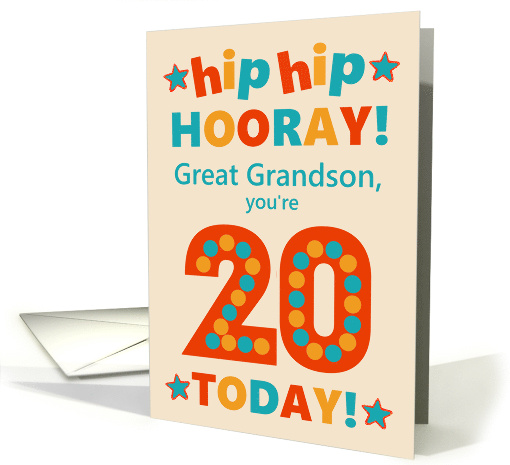A bright and cheerful birthday card for your great grandson, with colourful lettering on a cream background, 'Great Grandson, you're 20 TODAY! The red number 20 is extra-large and has big dots in golden yellow and a greenish blue. The inside message is just a suggestion and you can easily change it or delete it if you prefer something different or no printed inside message at all.