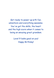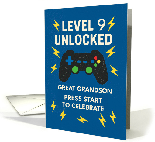 Send birthday power-ups to your game-loving great grandson! This playful design features “Level 9 Unlocked” in bold white lettering, paired with a cool video game controller and bright lightning bolts. The electric blue background gives the card a pop of energy—perfect for a 9-year-old with big dreams and a love of play. The inside message encourages him to enjoy the adventure ahead and reminds him how much he’s loved.