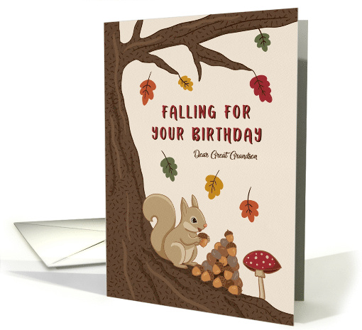 A charming fall birthday card featuring a playful squirrel surrounded by falling autumn leaves. Perfect for celebrating a loved one’s birthday in the cozy autumn season. For great grandson