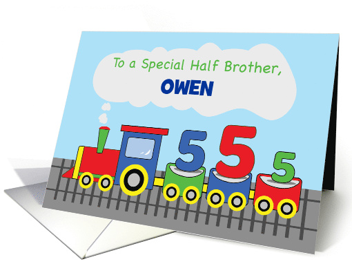 | Artist Notes: | We can see the smile on your face now that you have found the perfect card you are looking for to give and greet your half-brother a happy 5th birthday. Once you give him this card it will be his turn to smile from the fun message that this brings. This card also comes with a customizable front. |
