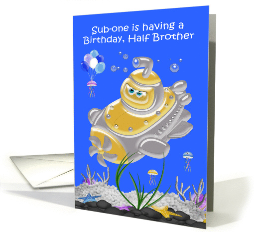 | Artist Notes: | Wish your special half brother Happy Birthday with a card featuring a yellow submarine with eyes showing emerged in a pretty ocean with colorful jellyfish, coral, and starfish with white text. Design by Laurie Schneider, Elements by La galerie de Jackie |