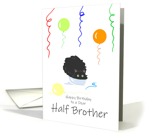 | Artist Notes: | Wish a dear half brother a happy birthday with this funny greeting card showing a cartoon image of a fluffy black cat peeking out of a tiny box, surrounded by a colorful background of balloons and streamers. Inside verse: "It's your special day! May you find a special spot and celebrate in your own special way." |