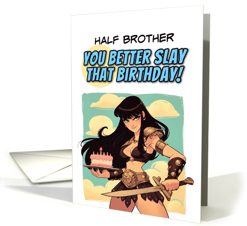 | Artist Notes: | A fierce warrior princess with a sword and a birthday cake is telling you it's time for celebrations. "Half brother you better slay that birthday!" A fun card for your amazing half brother who's putting another candle on their cake. |