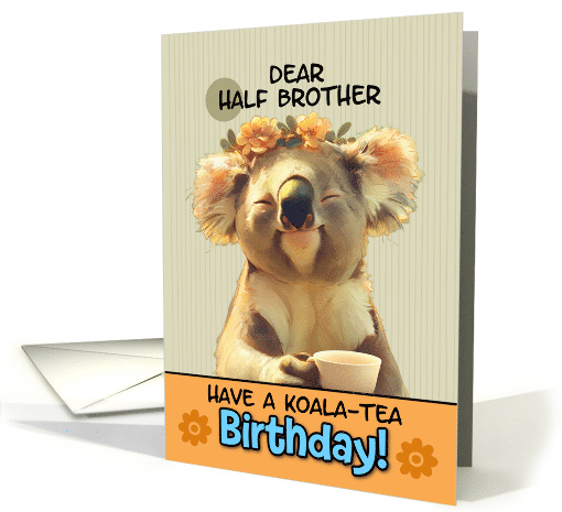 This birthday card features an adorable and whimsical illustration of a koala. The koala is depicted with a content, smiling expression and closed eyes, suggesting a state of blissful relaxation. It's wearing a delicate floral crown of small yellow-orange flowers, adding a touch of cheerfulness to its appearance. The koala is holding a white tea cup, which ties into the pun in the card's message. The background is a soft, striped pattern in a light beige color, giving the card a gentle, warm feel. At the bottom of the image is an orange banner containing the text "HAVE A KOALA-TEA Birthday!" This clever pun combines "koala" with "quality" to create a playful, tea-themed birthday wish.