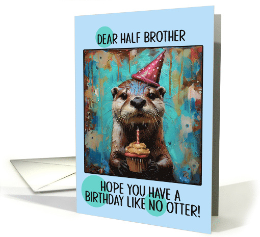 This delightful birthday card features a whimsical illustration of an adorable otter wearing a festive party hat and holding a delicious cupcake. The otter's fur is rendered with impressive detail, capturing its fuzzy texture and expressive eyes. The background is a vibrant, abstract swirl of blues, oranges, and browns, creating an underwater-like atmosphere filled with bubbles and splashes. The pun at the bottom, "Hope you have a birthday like no otter!" adds a playful, humorous touch that perfectly complements the charming otter illustration. A fun card to send to your wonderful half brother.
