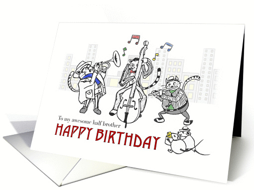 | Artist Notes: | This birthday card for a half brother features three groovy cats playing jazz music on the streets of the big city. There are two mice listening to the music. The card features the text "To my awesome half brother, Happy birthday" on the front. |
