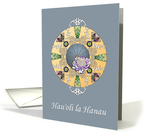 | Artist Notes: | Hau'oli la Hanau, birthday in Hawaiian. This abstract foliage and floral design is cast in a sphere colored in shades of orange. The foliage is colored in shades of green, grey, pink, blue and white. A second segmented sphere in dark blue sits in the center and is embellished with a purple chrysanthemum. The background is a bluish-grey color. All effects are digitally rendered. The inside of the card has been left blank. |