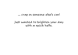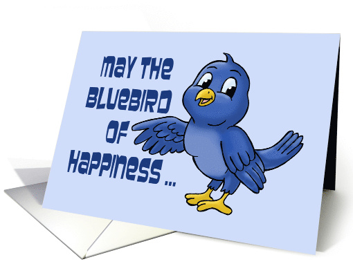 Hi/Hello card with a cartoon of a bluebird. The words say, May the bluebird of happiness ... Inside says, ... crap on someone else's car! Just wanted to brighten your day with a quick hello.