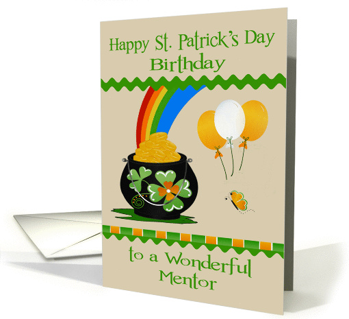 Wish your mentor a Happy St. Patrick's Day Birthday with a card featuring a pot of gold at the end of a colorful rainbow with white and gold balloons set on a solid background decorated with zigzags, a butterfly and green, fancy text. Inside like all GCU cards can be personalized by you if you wish to give it your own personal touch. Design by Laurie Schneider/Elements by J. Rett Graphics/Diana'z Designz