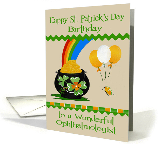 Wish a wonderful ophthalmologist a happy St. Patrick's Day Birthday with a card featuring a pot of gold at the end of a colorful rainbow with white and gold balloons set on a solid background decorated with zigzags, a butterfly and green, fancy text. Inside like all GCU cards can be personalized by you if you wish to give it your own personal touch. Design by Laurie Schneider/Elements by J. Rett Graphics/Diana'z Designz