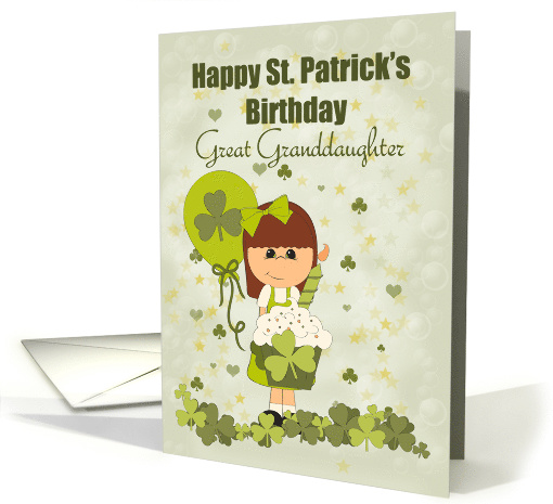 Celebrate your Great Granddaughter's St. Patrick's Day Birthday with this sweet card, featuring a green background with faded scattered gold stars, green hearts and clovers and faded bubbles. In the center is a young girl wearing green, holding a big cupcake with a candle and a green balloon on her right, with a green clover garland at the botton. Girl, Balloon, Cupcake and Garland original design by Trina Clark at DollarGraphicsDepot. All my cards can be customized.