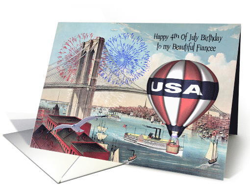 Artist Notes: | Wish your beautiful fiancee a Happy 4th Of July Birthday with a card featuring red, white and blue fireworks over and behind the Brooklyn Bridge with a hot air balloon floating by and a beautiful seagull in flight. Design by Laurie Schneider, elements by WPClipart, Dianaz Designz, Simple Sumara |