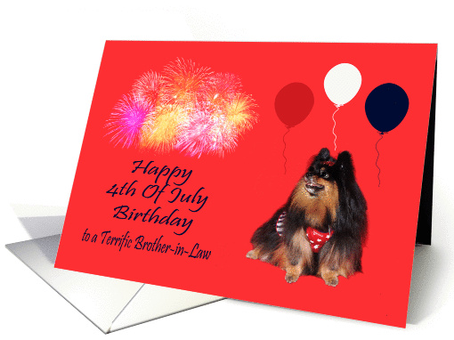 Wish a terrific brother-in-law a Happy 4th Of July Birthday with an adorable sable Pomeranian wearing a patriotic dress with a bow in her hair watching the fireworks with red, white and blue balloons over her cute little head. Inside, like GCU cards can be personalized by you if you wish.