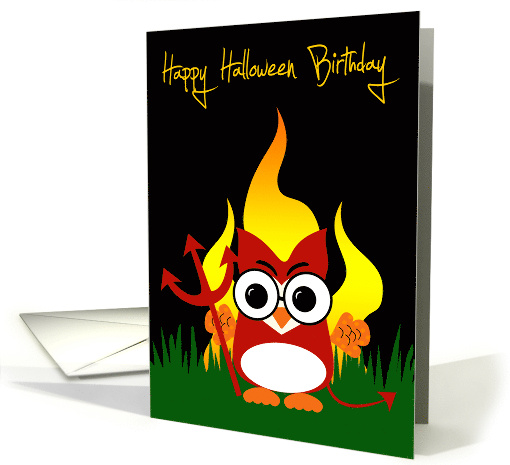 Wish anyone in general a Happy Halloween Birthday with an adorable, devil owl standing in the grass holding a pitchfork in front of large yellow flames at night. Inside like all Greeting Card Universe cards can be personalized by you if you wish to give it your own personal touch. Owl by Nini Scrap