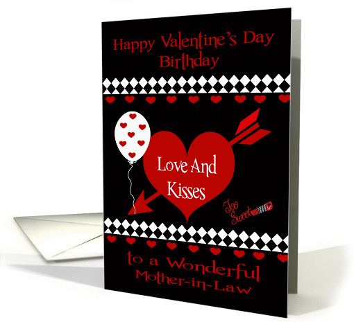 Wish your wonderful mother-in-law a Happy Valentine's Day Birthday with a large red heart with an arrow reading "Love And Kisses". Background is black with a pretty white diamond design, a balloon and a red lipstick writing too sweet with red text. Inside like all GCU cards can be personalized by you if you wish to give it your own personal touch. Design by Laurie Schneider/Elements by J. Rett Graphics and Diana'z Designz
