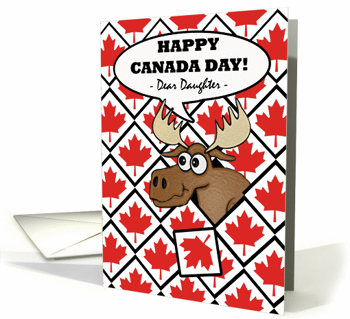 | Artist Notes: | Happy Canada Day for a dear daughter greeting card. Features a moose, maple leaf tiles, and large speech bubble at the top of the image. Black outlines make this a bold image. |