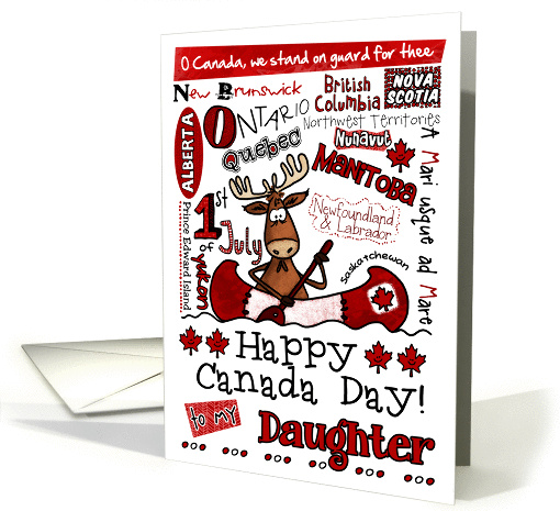 | Artist Notes: | A cartoon moose is paddling his red and white canoe amongst a scattering of Canadian provinces and territories spelled out in a playful word cloud. A row of red smiley faced maple leaves complete this festive Happy Canada Day card for your Daughter |