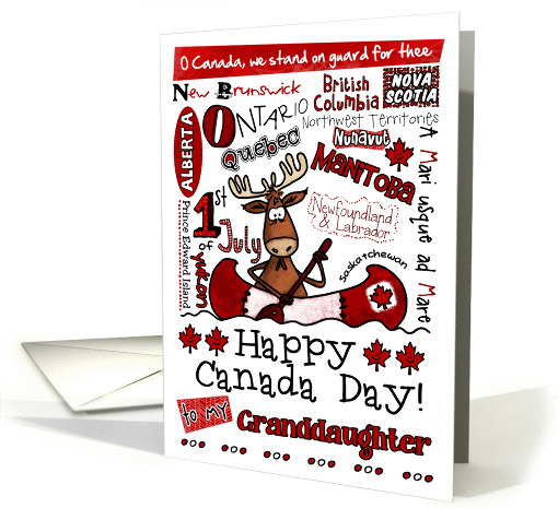 | Artist Notes: | A cartoon moose is paddling his red and white canoe amongst a scattering of Canadian provinces and territories spelled out in a playful word cloud. A row of red smiley faced maple leaves complete this festive Happy Canada Day card for your Granddaughter |