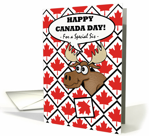 | Artist Notes: | A special Canada Day card for a special sister. Cute and funny moose head has a humorous look on its face as it knocks out a tile from a wall. Tiles have a red maple leaf on a white background, outlined with black. |