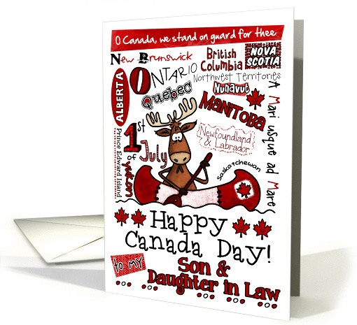 | Artist Notes: | A cartoon moose is paddling his red and white canoe amongst a scattering of Canadian provinces and territories spelled out in a playful word cloud. A row of red smiley faced maple leaves complete this festive Happy Canada Day card for your Son and Daughter in Law |