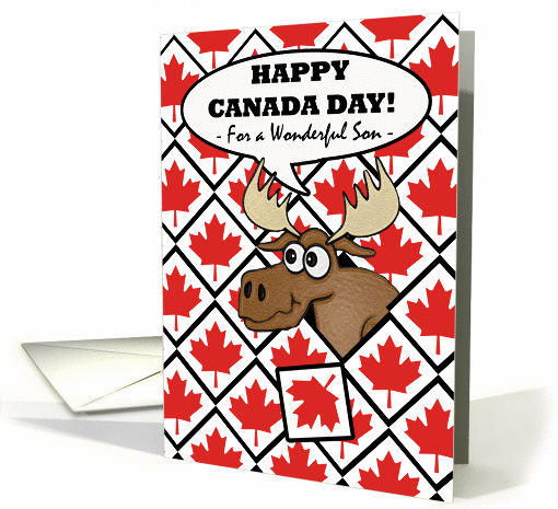 | Artist Notes: | Happy Canada Day for a Wonderful Son. Caption in a large speech bubble over a funny looking moose head. Moose is coming through a wall of red maple leaves that are arranged in a diamond geometric repeated pattern.Contemporary upbeat design. |