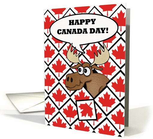 | Artist Notes: | A funny moose head breaks through a wall of Canadian maple leaf panels to wish someone a Happy Canada Day. Text in white on a red background. Bold geometric design. |