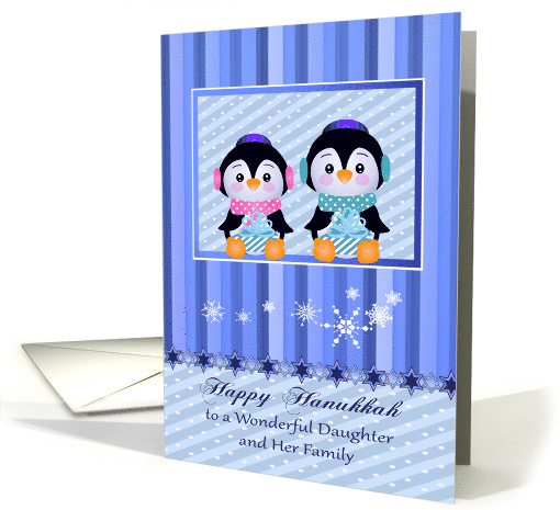 Wish your wonderful daughter and her family a Happy Hanukkah with a card featuring two adorable penguins wearing yarmulkes, scarfs, bows, and earmuffs sitting on a pretty frame trimmed in Star Of Davids with dark blue, fancy text. Design by Laurie Schneider, elements by J Rett Graphics, Nini Scrap