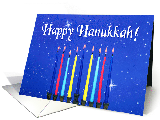Colorful Menorah candles burning brightly against a blue starry background. Perfect holiday greeting for Jewish friends and family.
